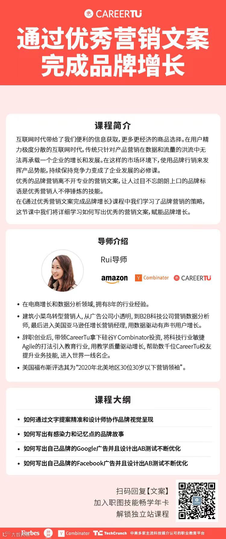 优秀的品牌营销离不开专业的品牌文案,对于想要学习更多关于优秀营销文案知识、通过文案营销赋能品牌增长的同学,CareerTu职图新推出了一套营销文案课程!