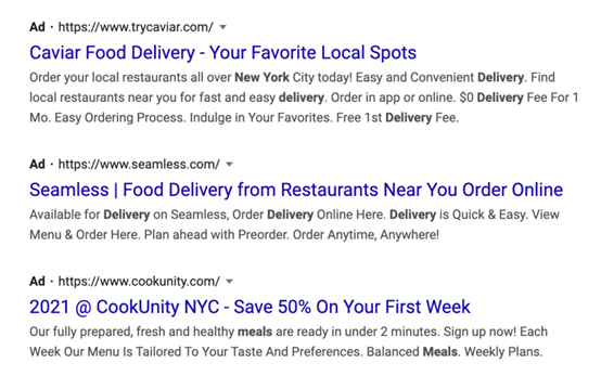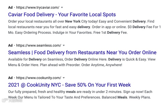 正如上面的“食品配送”关键词的搜索查询结果示例所示,Caviar和Seamless两家食品运输公司不约而同在广告中反复引用关键词“配送”高达4-5次,以不断强化他们是一家提供食品配送服务的企业这一信息点。