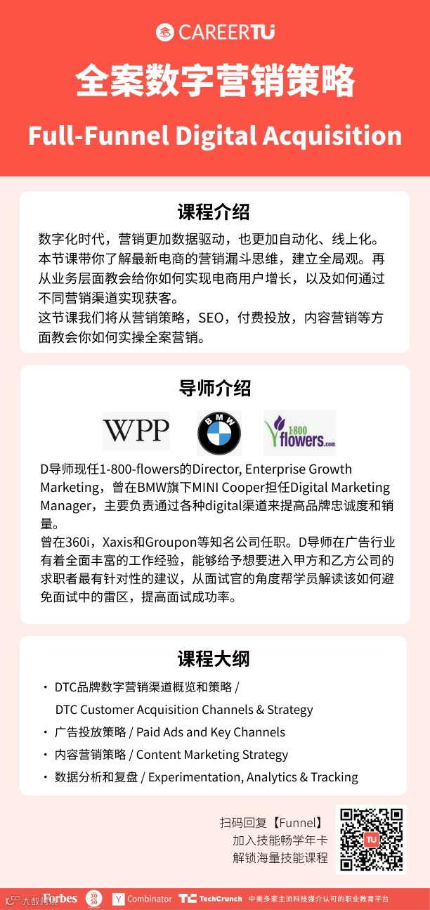 想要学习更多数字营销、数据分析、产品设计等数字化知识和技能的伙伴们,赶快锁定CareerTu职图!免费领取白皮书!