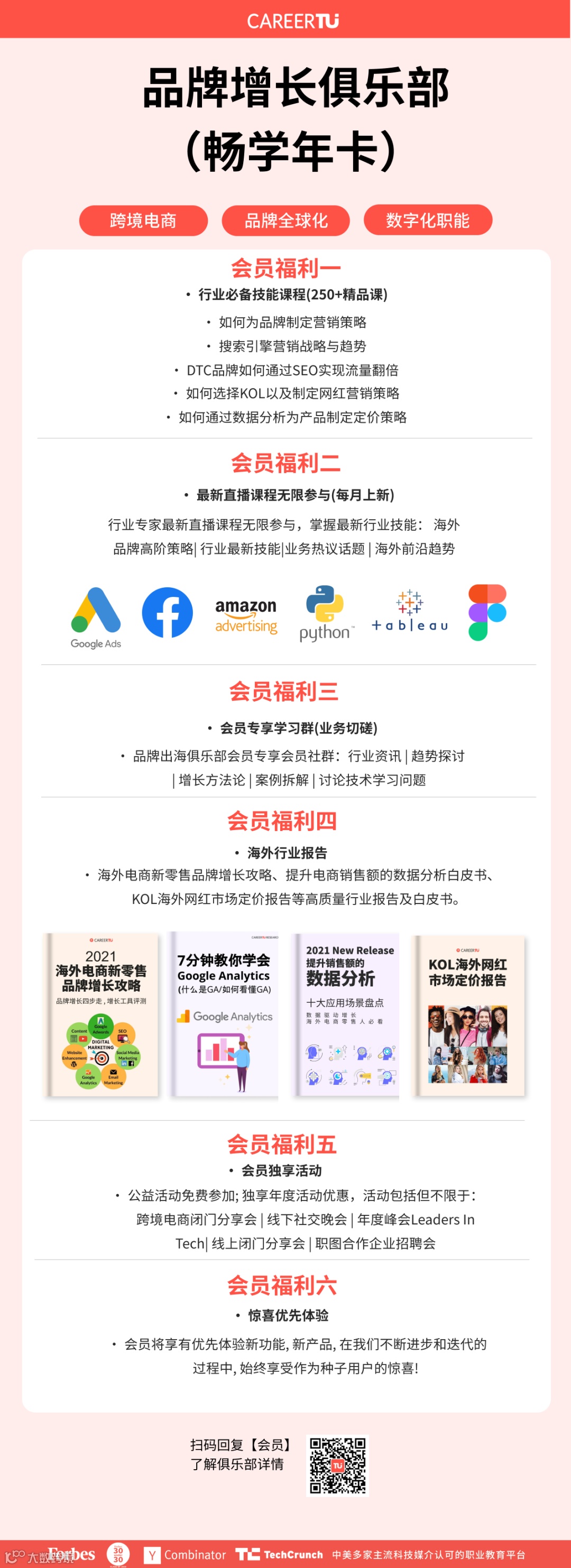 会员全年无限畅学品牌全球化技能:数字营销Digital Marketing, 商业分析Business Intelligence, 数据分析Data Analytics, 电商增长设计Growth Design、电商增长 Growth Marketing。