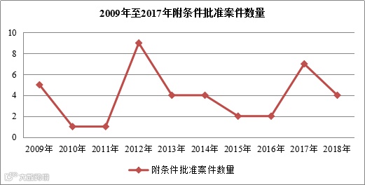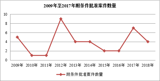 2018年,反垄断局共附条件批准了四起案件。下表列出了2009至2018年附条件批准案件数量图: