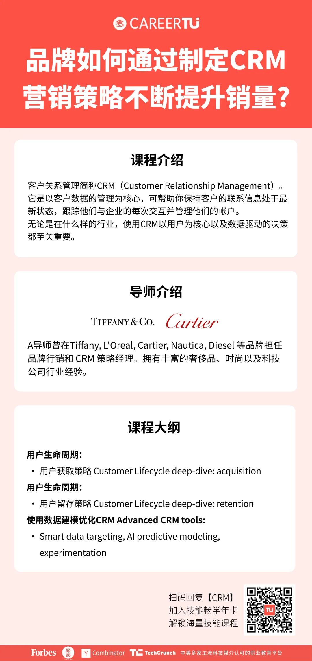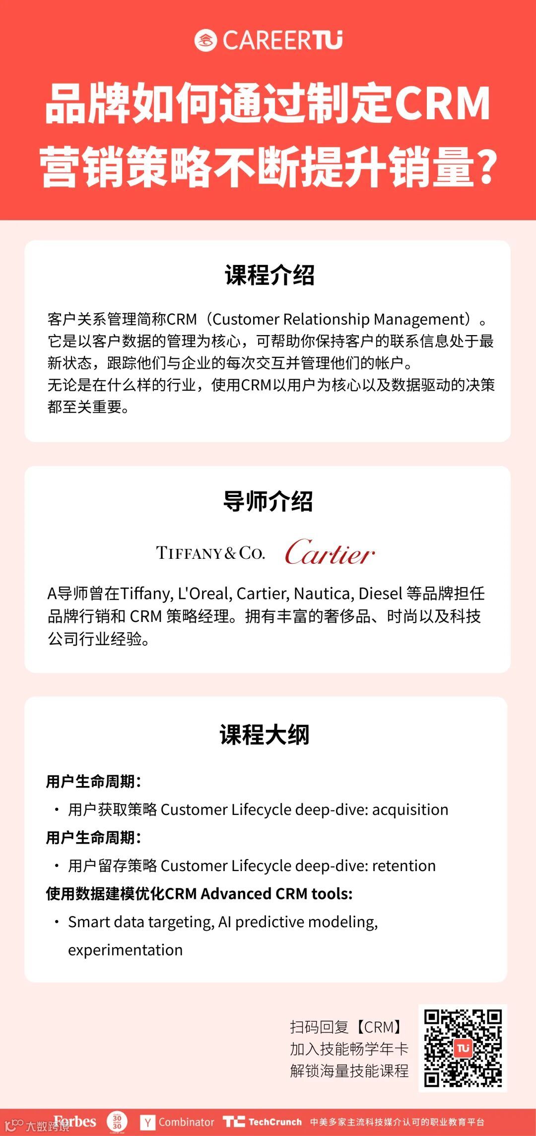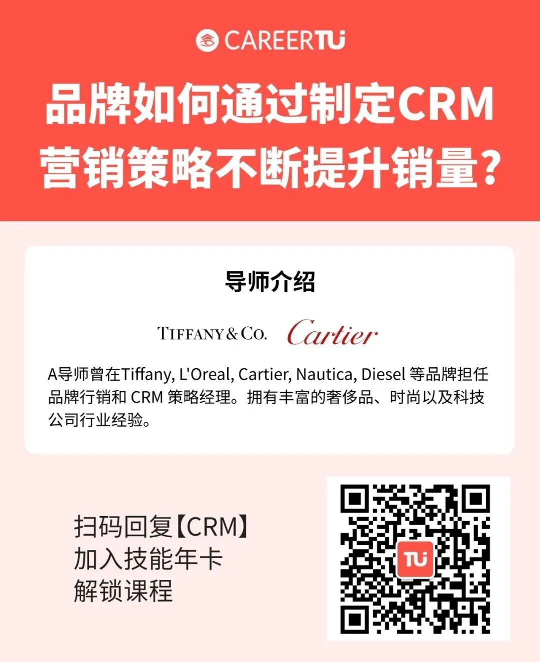 对品牌营销感兴趣,希望提升用户产品粘度、销量的同学,可以学习CareerTu职图推出的客户关系管理(CRM)技能课程!业界大牛导师将分享通过制定CRM营销策略,提升品牌销量的秘诀!