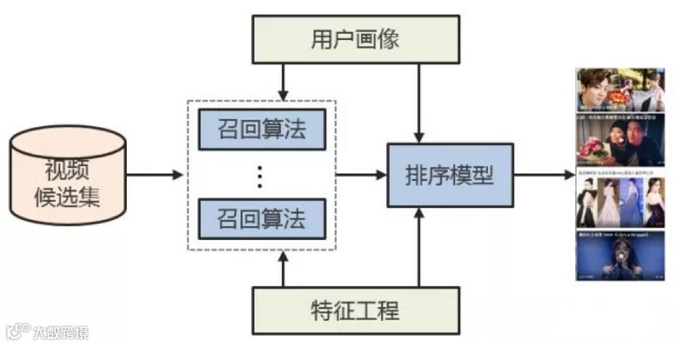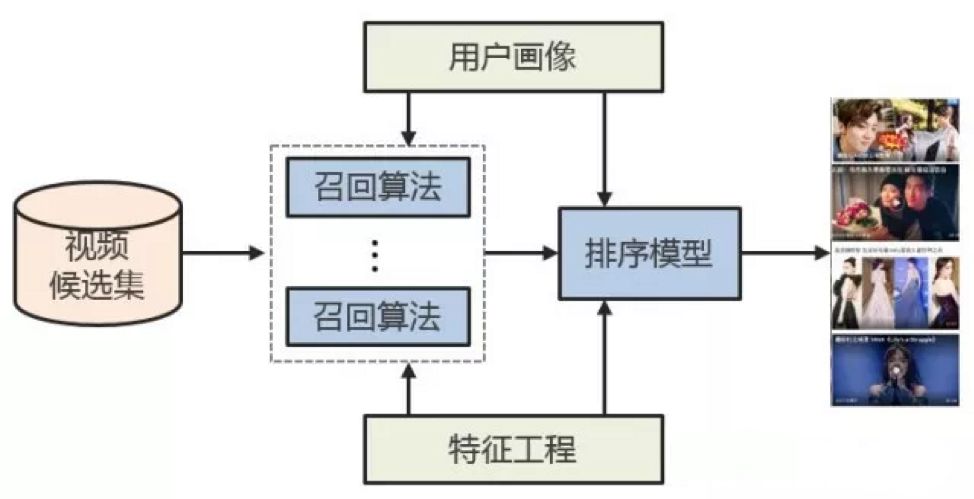召回阶段会通过用户画像,经过多维度的分析解读用户的人群属性、历史观看记录、兴趣内容和偏好倾向,在千万级的视频库中挑选出几百到几千个用户感兴趣的视频内容。