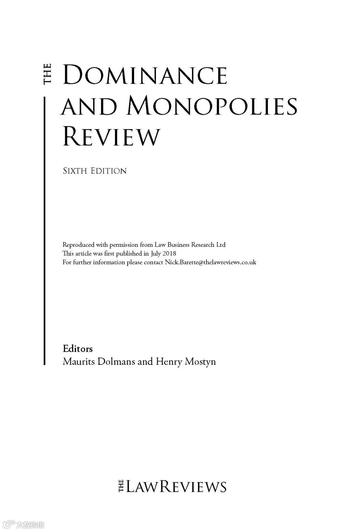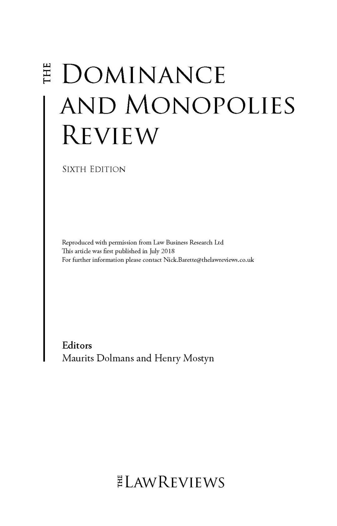 近日,全球知名的法律出版物《法学评论》(The Law Reviews)正式发行第六版Dominance and Monopolies Review。该书由全球二十八个司法辖区顶级反垄断律师及专家执笔,详细介绍了各国关于纵向垄断和滥用市场支配地位的立法、司法和执法相关问题和最新发展情况。