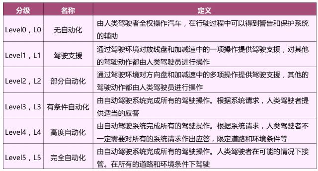 目前,国际较为通用的自动驾驶车辆发展分级标准为美国机动车工程师协会(SAE)的分类,SAE将汽车自动化定义为以下几个层次: