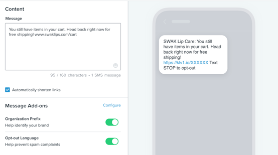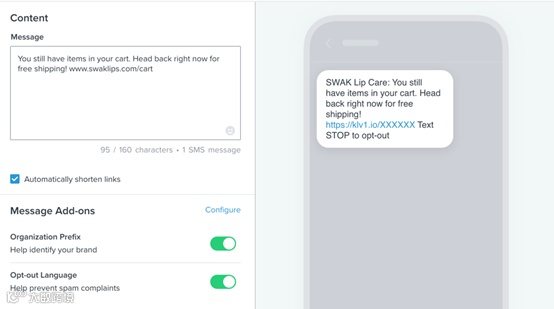 而Klaviyo强大的短信营销功能,可以帮助你快速根据不同营销活动的诉求配置不同的内容文案,例如 👇