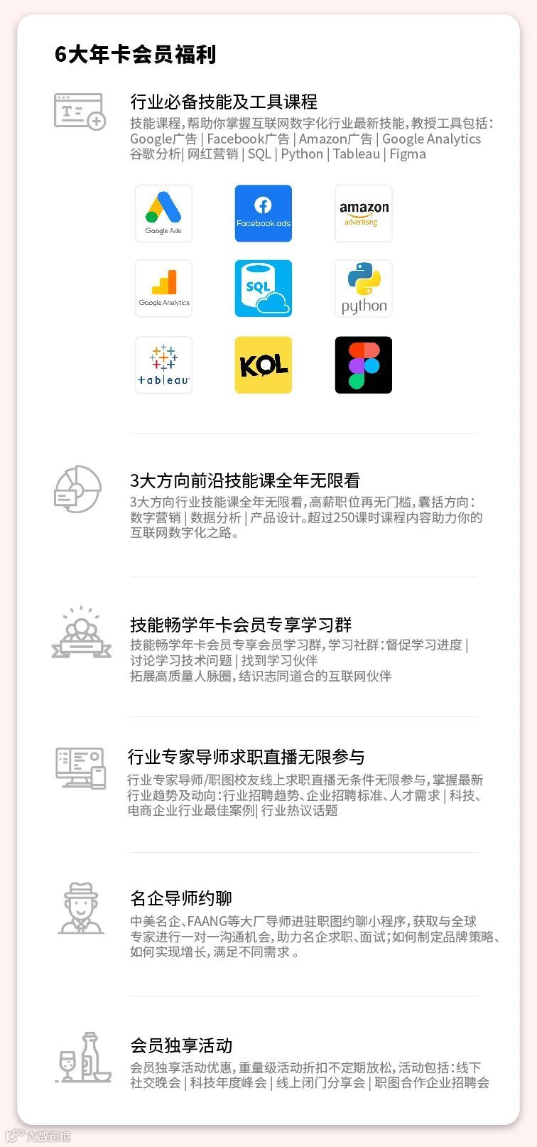 职图技能畅学年卡全年无限观看互联网数字化高薪职能的必备技能。品牌全球化必备技能:数字营销Digital Marketing, 数据分析Data Analytics, 商业分析Business Intelligence, 产品交互设计Product Design。海外专家授课。导师来自:Amazon, Google, Facebook, TikTok, Casper, LVMH等。