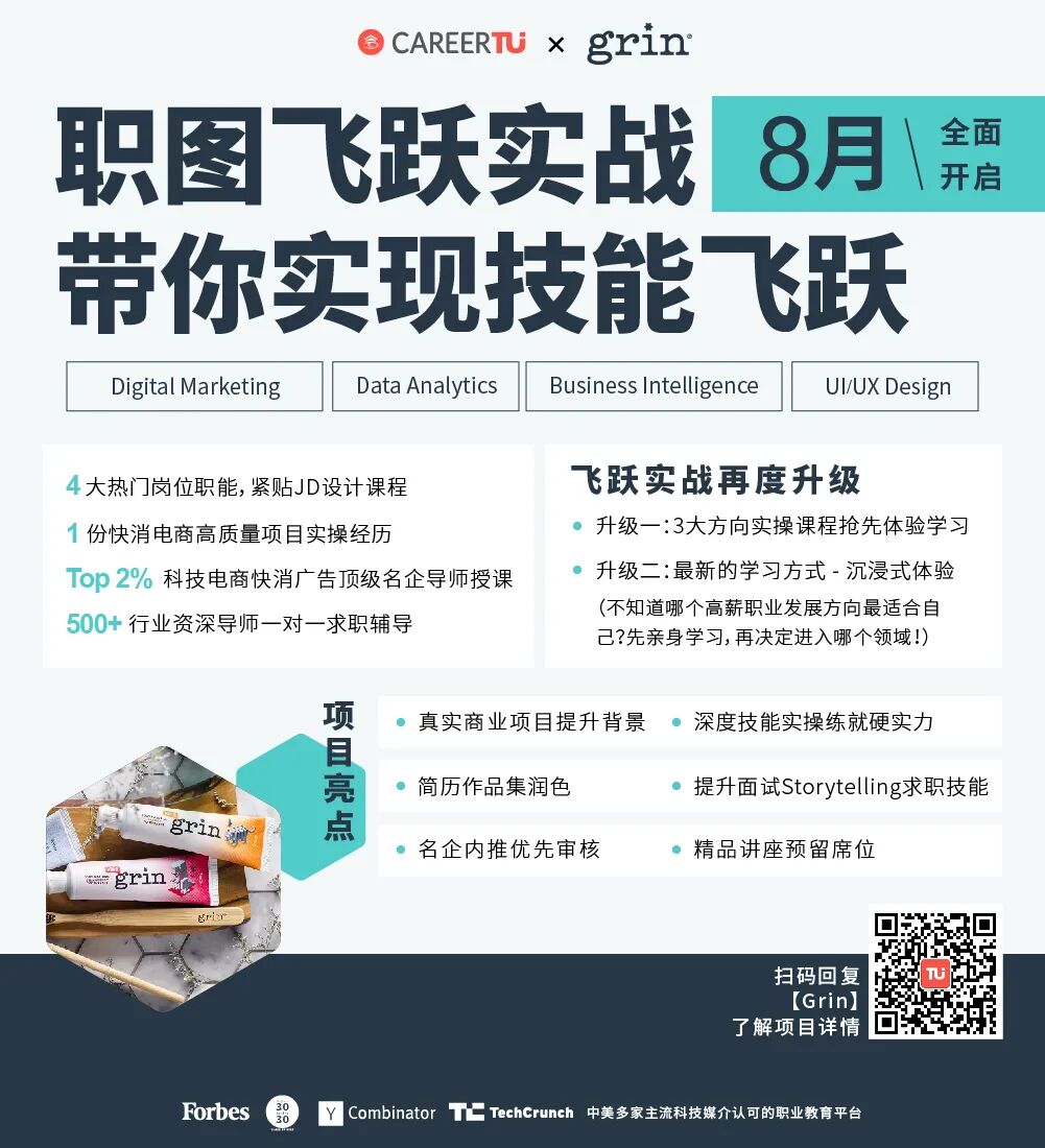 为了帮助大家快人一步,做好求职准备,顺利拿到Dream Offer!职图飞跃实战项目即将开始,所有所有学员将直接上手参与职图×Grin联名的商业实战项目,在北美一线互联网大厂导师带领下,了解行业趋势,学习和巩固最新的专业知识!