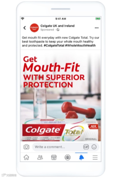 Colgate的代理商RedFuse与Facebook Creative Shop合作,创建了多个针对Facebook和Instagram feed和Stories设计的视频。这名广告创意人的想法是“mouth fit”,使用分屏格式将牙齿卫生的概念与瑜伽,日常训练和跳绳之类的健康和保健活动相结合。