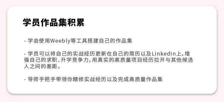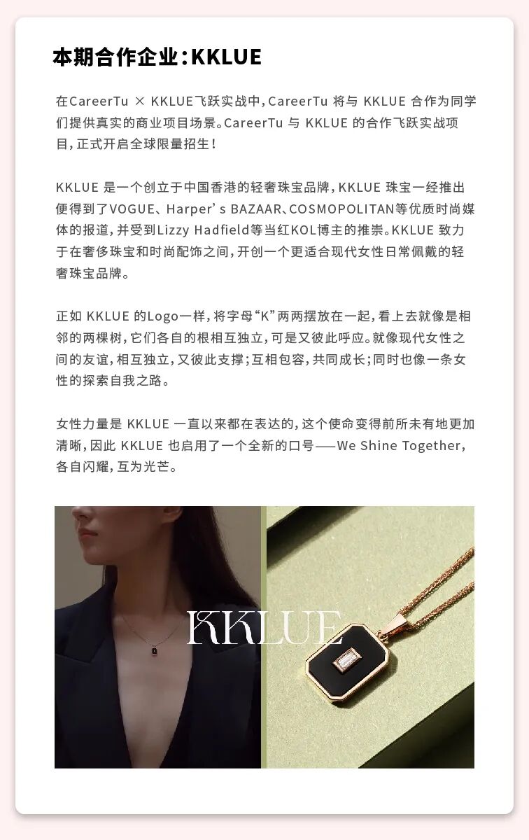 另一方面,在100%真实电商工作场景中,你将积累高含金量作品集,丰富简历,面试有话讲!求职硬实力+背景提升+丰富作品集,全面帮助你冲刺心仪Offer!