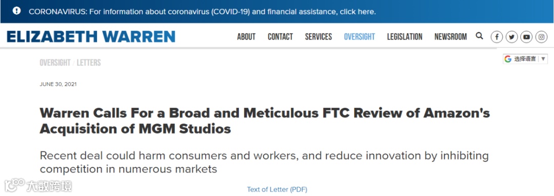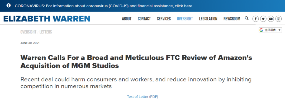 Doug Melamed 指出,新任美国联邦贸易委员会主席 Lina Khan有过这样的想法,鉴于她之前对亚马逊市场的批评,亚马逊已经要求Lina Khan退出进行中的反垄断调查。民主党参议员Elizabeth Warren在本周致信联邦贸易委员会,敦促其对米高梅的交易进行“广泛而细致的审查”,认为它可能对流媒体行业产生反竞争影响。