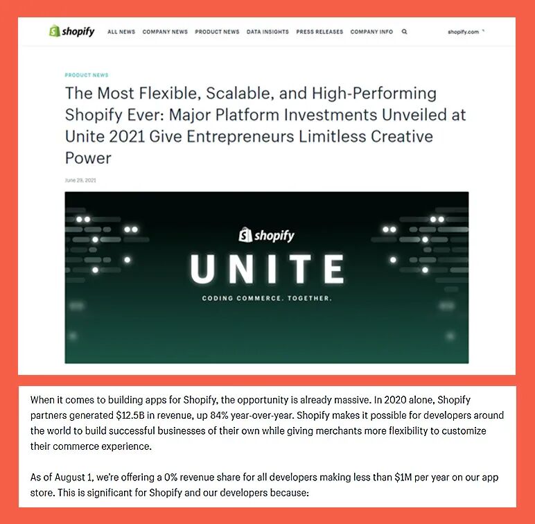 6月29日,一站式电商服务平台Shopify在开发商年度大会上宣布,将降低向对在其应用商店发布应用程序的开发商收取的佣金。
