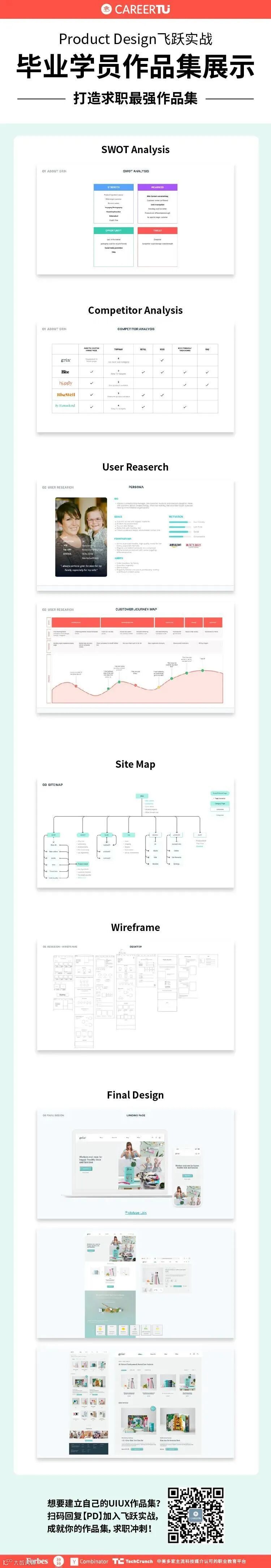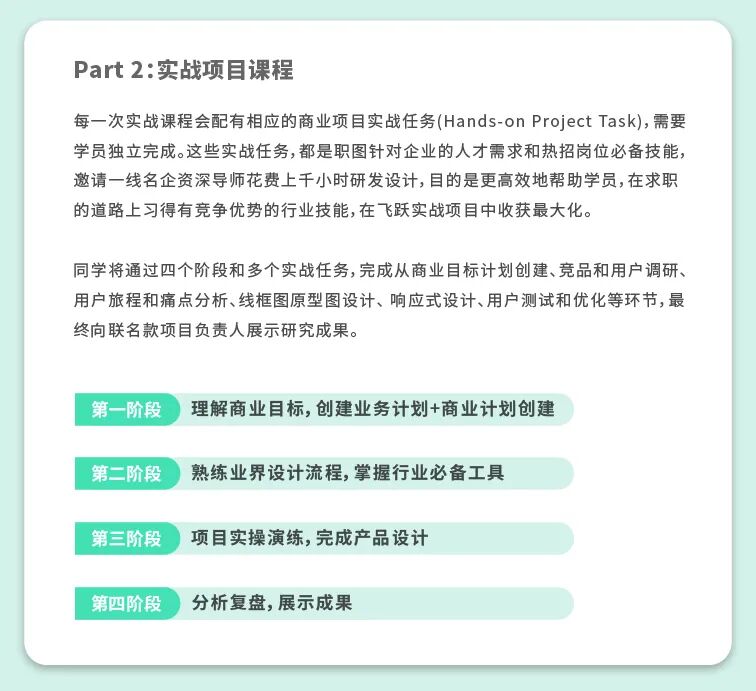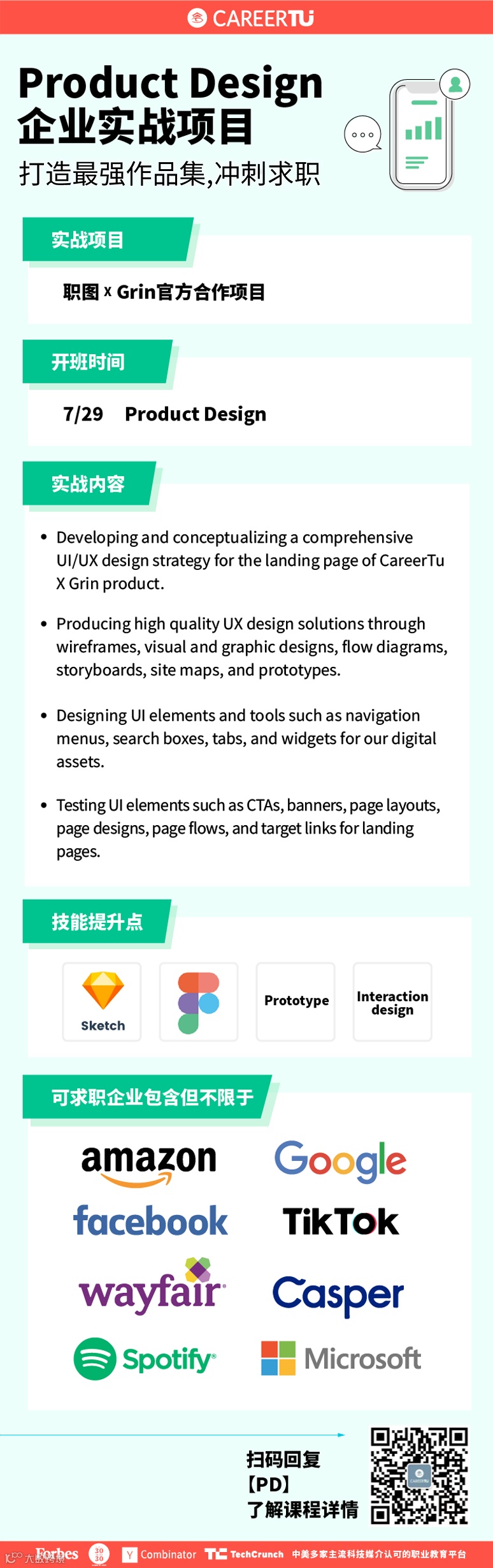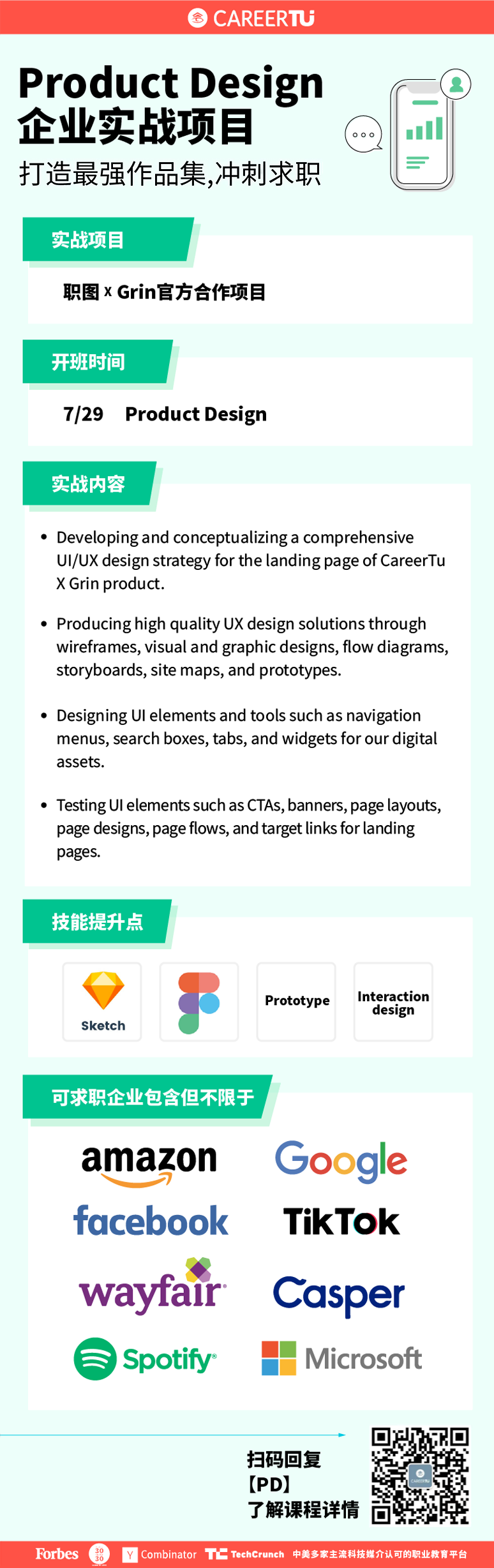 为此,我们为想要快速拿到Offer的同学,或是想要积累实操经验,丰富简历的同学,推出了升级版的飞跃实战项目,所有学员将直接上手参与职图×Grin联名款产品的商业化推广,为其设计网站产品界面,在FLAG的资深导师带领下,巩固专业知识!另一方面,在实战项目中,你将积累高含金量作品集,丰富简历,面试有话讲!求职硬实力+背景提升,全面帮助你斩获心仪Offer!