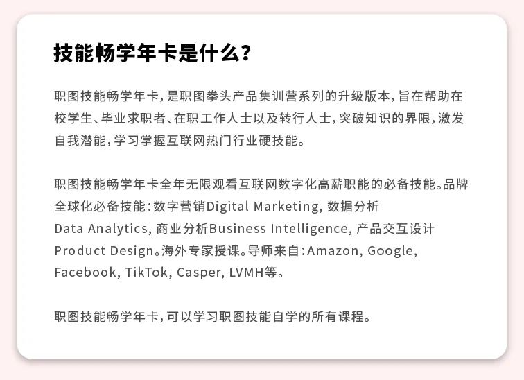 职图技能畅学年卡全年无限观看互联网数字化高薪职能的必备技能。品牌全球化必备技能:数字营销Digital Marketing, 数据分析Data Analytics, 商业分析Business Intelligence, 产品交互设计Product Design。海外专家授课。导师来自:Amazon, Google, Facebook, TikTok, Casper, LVMH等。