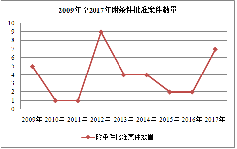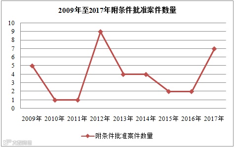 2017年,商务部共附条件批准了七起案件,较前几年有大幅增长。下表列出了2009至2017年商务部附条件批准案件数量图: