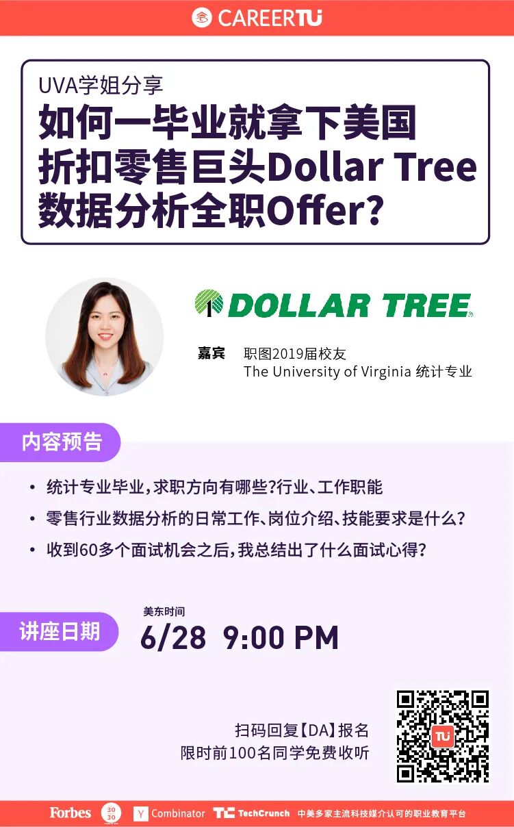 美东时间6月28日9PM,我们邀请到了CareerTu校友,来自UVA的学姐,来为大家分享数据分析的求职必备技能及职业发展方向、面试心得,限时前100名同学免费收听!