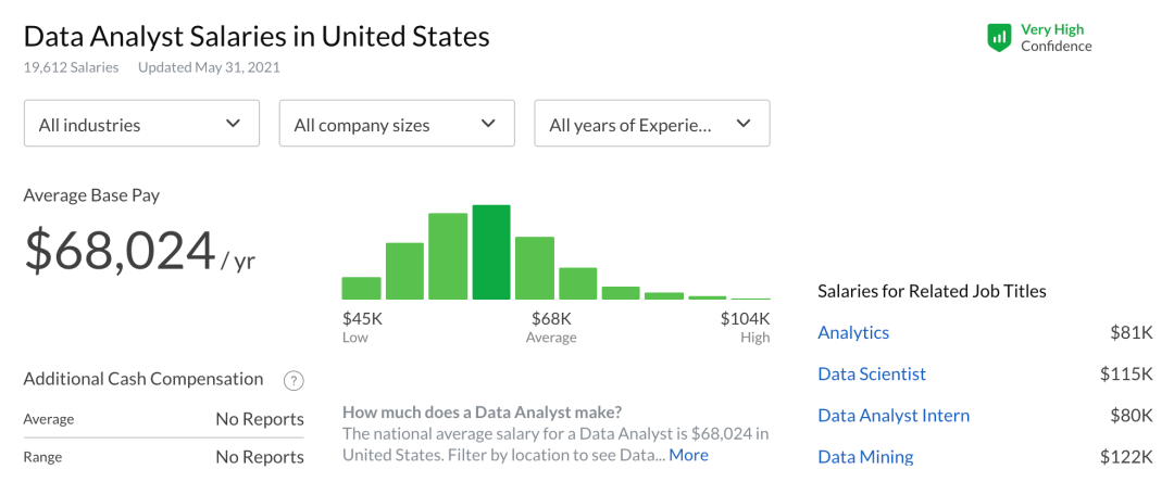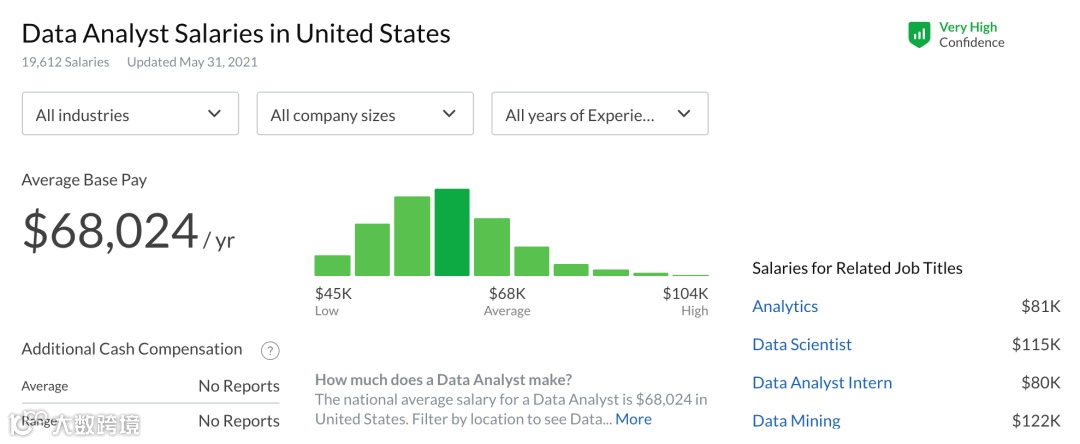 人才需求大于供应,这意味着公司愿意支付更高的薪资来填补空缺职位。根据最新数据显示,在美国,数据分析师的全美平均薪资为 68,024 美元。由此可见,数据分析岗的薪资高,发展前景好。