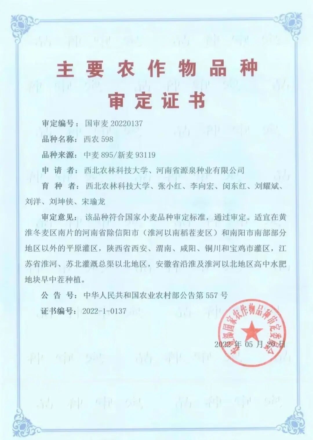 “西农598”审定证书