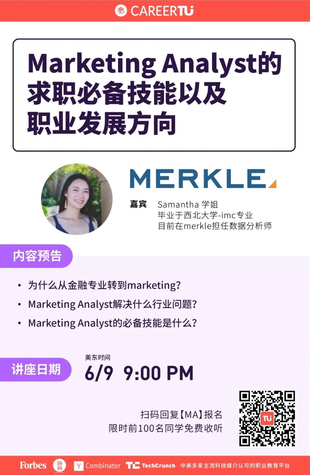 美东时间6月9日9PM,我们邀请到了CareerTu校友为大家分享Marketing Analyst的求职必备技能及职业发展方向,限时前100名同学免费收听!