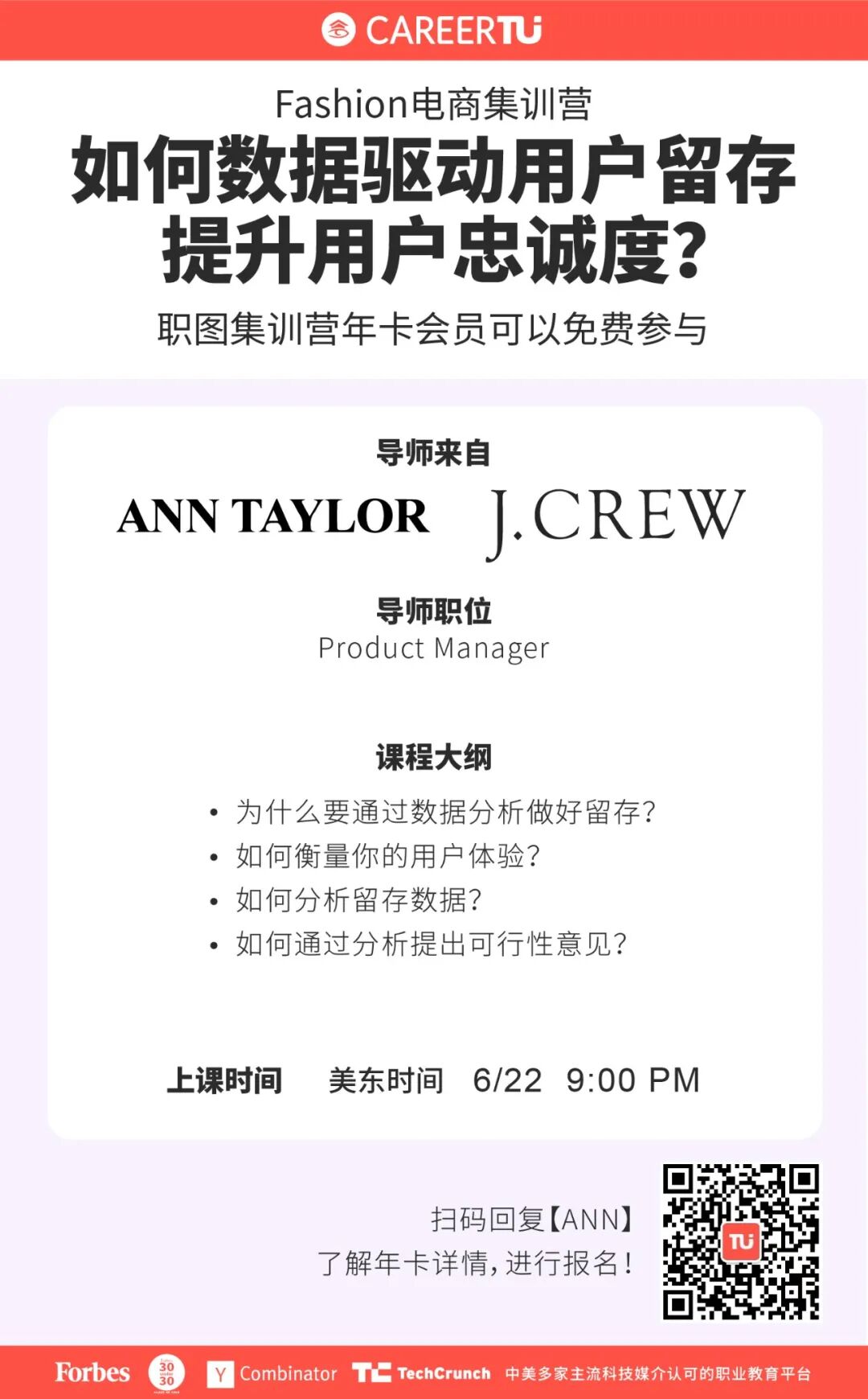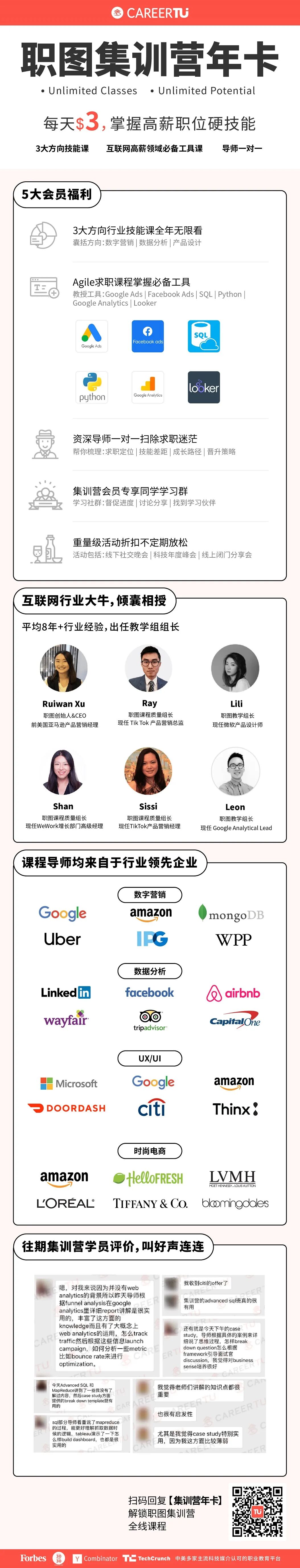 别着急,CareerTu的Fashion电商集训营可以帮到你,包含四大方向:Digital Marketing、Marketing Analyst、Business Analyst、Data Analyst、UIUX的求职干货,你将在行业一线时尚电商导师的带队下,学习专业知识,弥补你在行业经验的欠缺,全面帮助你冲刺时尚、电商行业心仪Offer!