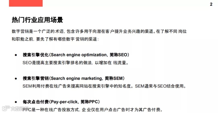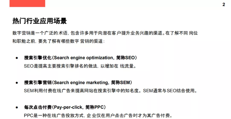 目前行业中热招的高薪职位有Digital Marketing、Business Intelligence、Product Design、Data Analytics四大类,这四大类也会衍生出很多小的分支,面对行业中职位种类多种多样,对于岗位工作内容不了解,行业应用场景不清晰?在行业百科白皮书中,将会针对岗位具体工作内容及应用场景进行详细讲解。哪怕刚开始接触也能对于岗位工作场景了然于心。