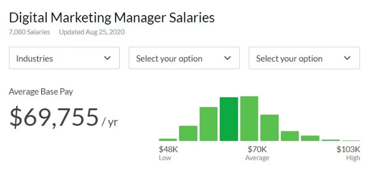 以全美Digital Marketing Manager岗位的薪资为例,平均工资为6.9万美元,高于传统Marketing行业将近2万美元。大厂Digital Marketer的职位薪资还会上浮0.5~1万美元不等。