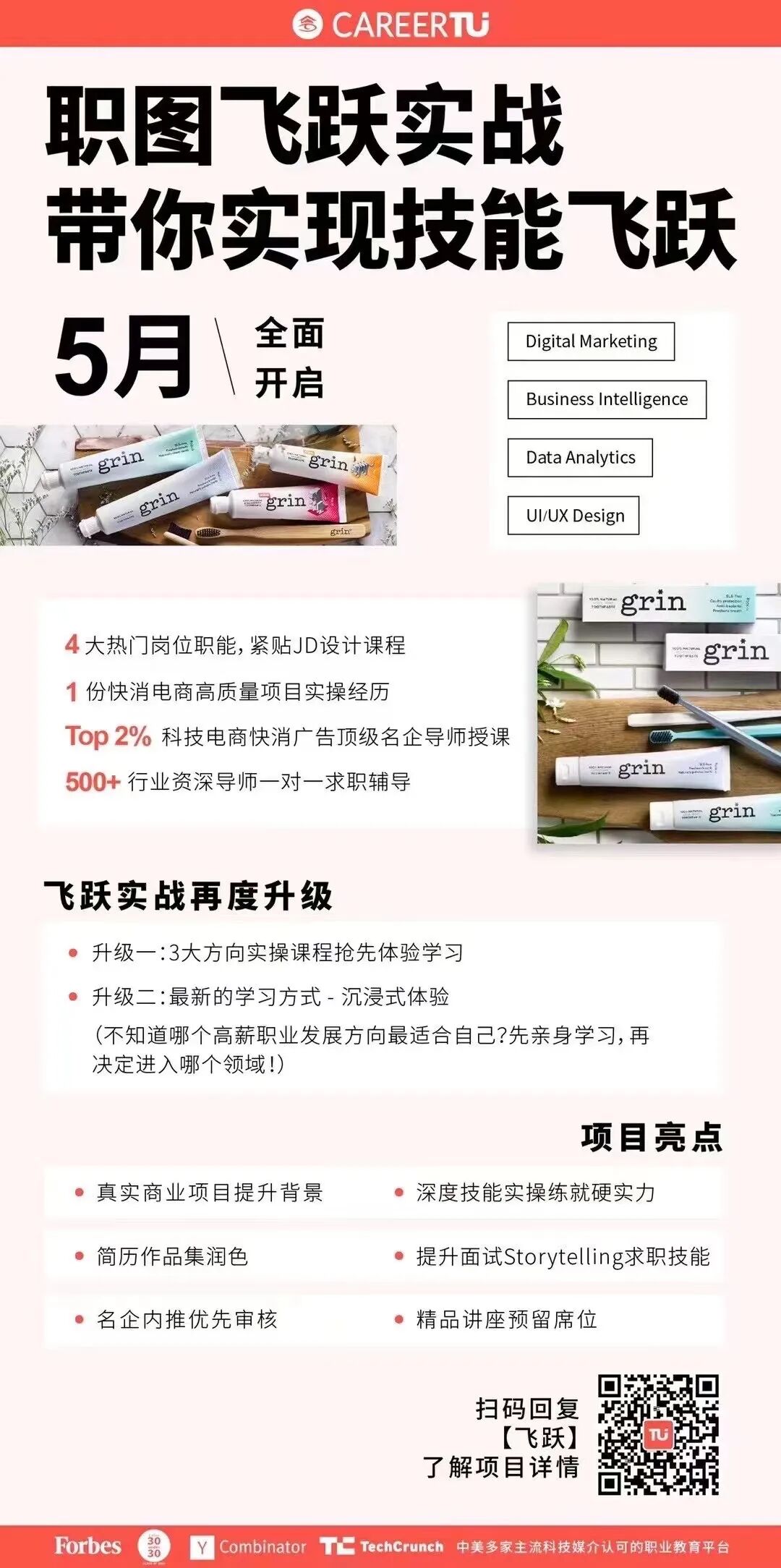 在职图 × Grin 飞跃实战中,CareerTu 将与 Grin 合作为同学们提供真实的商业项目场景。项目学员跟着Flag导师参与到此次企业实战中,为品牌制定营销计划。最大程度上,帮助同学获得真实企业项目经历,进行背景提升。通过背景提升项目,让你在综合素质、领导能力、技能等方面获得迅速提升,展现给名校面试官一个独特且潜力无限的自己!项目包含行业知识集训,高质量项目实操,作品集积累,文书辅导,面试辅导等,让你在短期内以最高效的方式拿下斩获Dream Offer的入场券!