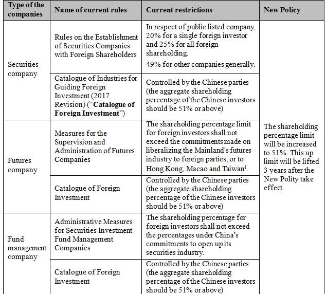 1.The limit on the percentage of the shares held by a single foreign investor or jointly held by several foreign investors (directly or indirectly) in the securities, fund manage and futures companies will be increased to 51%. This up limit will be lifted three years after the New Policy take effect.