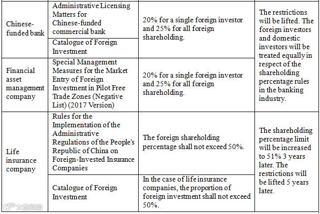 2.The limit on the shareholding percentage of a foreign investor in the Chinese-funded banks and financial asset management companies (which is 20% limit for a single foreign investor and 25% limit for all foreign shareholding) will be lifted. The foreign investors and domestic investors will be treated equally in respect of the shareholding percentage rules in the banking industry.