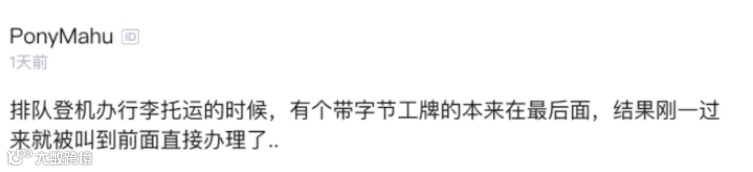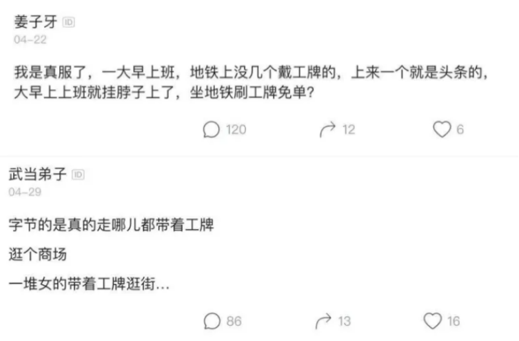 事情最开始的起因是因为最开始的那条评论,有人在论坛吐槽,经常看到字节跳动的员工无时无刻都带着工牌。