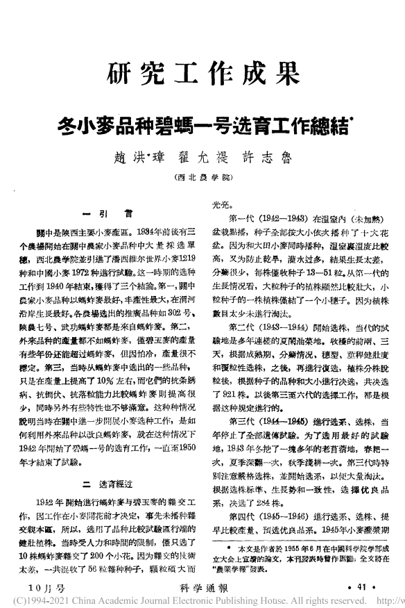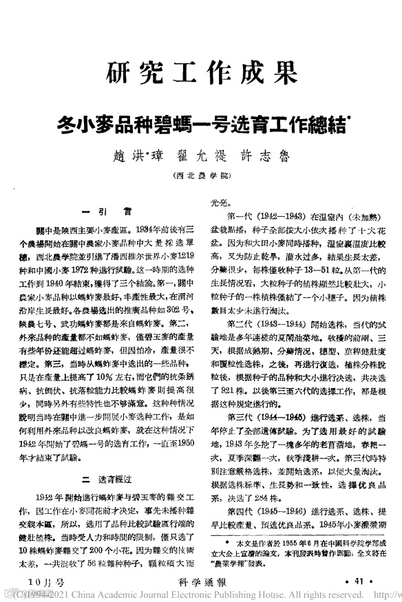 赵洪璋等就“碧蚂一号”小麦品种的选育撰写论文。