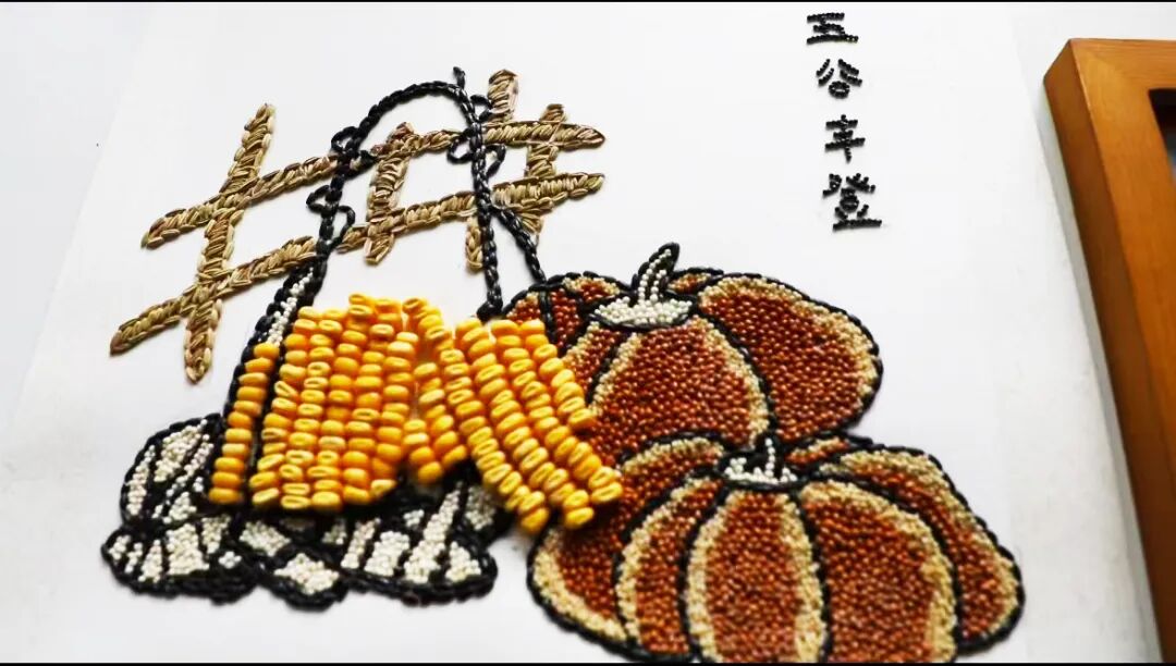 白色的大米、金黄的小米、绿色的绿豆、黑色的油菜籽......这些常惯的五谷杂粮,经过艺术性的表达,整齐排列在画板上,形成一幅仓廪富足的美景丰收图,这便是传统技艺五谷画的魅力和价值所在。