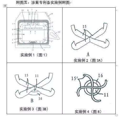 显然,二审法院对实施例1的解读更符合发明目的,也更全面客观合理。北京市高级人民法院《专利侵权判定指南(2017)》第59条规定,被诉侵权技术方案属于说明书中明确排除的技术方案,或者属于背景技术中的技术方案,权利人主张构成等同侵权的,不予支持。从形式上看,说明书明确记载,实施例2、3是空气导向构件的两种实施方式,实施例4是一种替代实施方式,并未将实施例1置于并列的地位。从内容上看,实施例2、3、4都设置有空气导向肋,实施例1中并未体现此共同点,而且还有文字记载“该空气导向部分11 向上收缩的周边表面16协助引导从通道9而来的空气(见图1)”。结合背景技术的描述和无效决定的评述来看,实施例1的截头锥形向上收缩的结构构件在功能上更接近对比文件2的底部壁凸起,它们都无法确定能实现“将空气流基本上向上导引”的功能。被诉侵权产品并无空气导向肋,但具有截头锥形向上收缩的结构,因此,被诉侵权产品在功能上应该是更接近实施例1和对比文件2,远离实施例2、3、4。