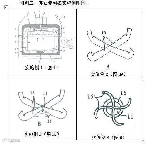 飞利浦公司认为,“空气导向构件”对应于说明书中的四个实施例,如下图所示,其主张以实施例1作为侵权比对的基础。