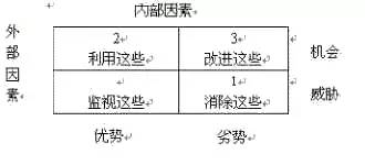 或者用SWOT分析表,将刚才的优势和劣势按机会和威胁分别填入表格。