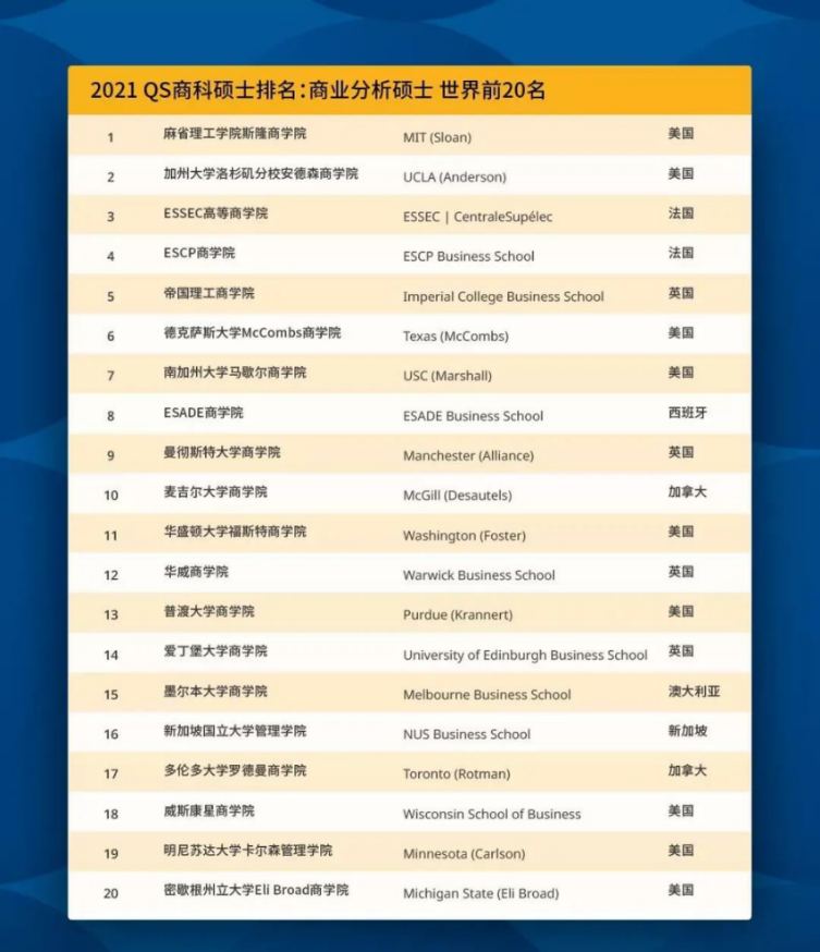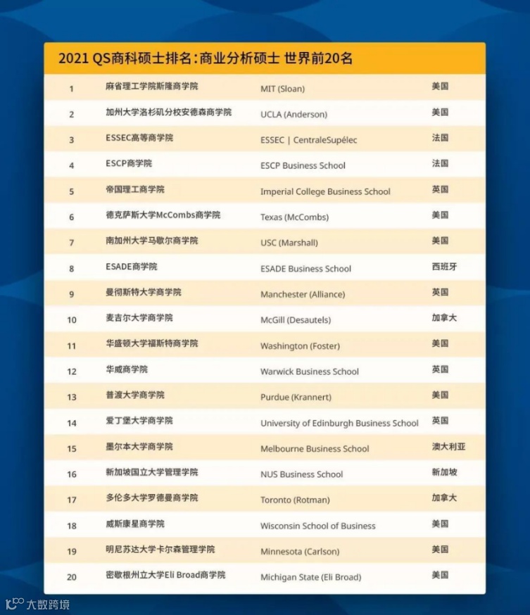 每年QS发布全球学校排名,榜单一定是被美英高校霸榜,而商业分析专业同样如此,在QS发布的2021全球商业分析硕士排名前20的高校中中,美英就占据13所!