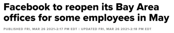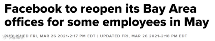 同样作为科技巨头的Facebook也表示,湾区办公室将在2021年5月10日重新开放,Fremont办公室将会在5月17日重新开放,Sunnyvale预计于5月24日重新开放,旧金山市中心的两座办公楼预计在6月7日重新开放。而西雅图办公室将会更早,预计在今年4月份就会重新开放。