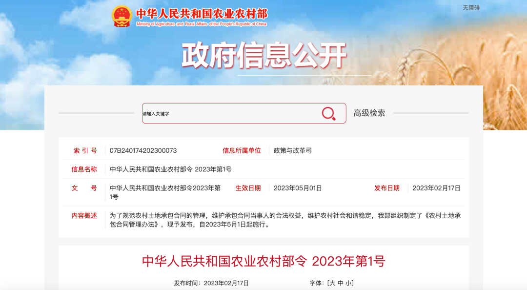 近日,农业农村部发布了《农村土地承包合同管理办法》(农业农村部令2023年第1号)(以下简称《办法》),并将于2023年5月1日起施行。《办法》出台背景如何?对农村土地承包合同管理有哪些新规定?记者就此采访了农业农村部负责人。