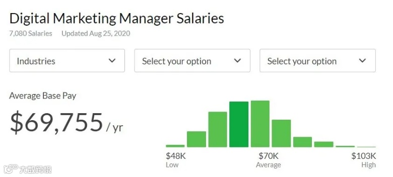 包含Digital Marketing, Marketing Analytics, Product Marketing等领域,以全美Digital Marketing Manager岗位的薪资为例,平均工资为6.9万美元,高于传统Marketing行业将近2万美元。大厂DigitalMarketer的职位薪资还会上浮0.5~1万美元不等。