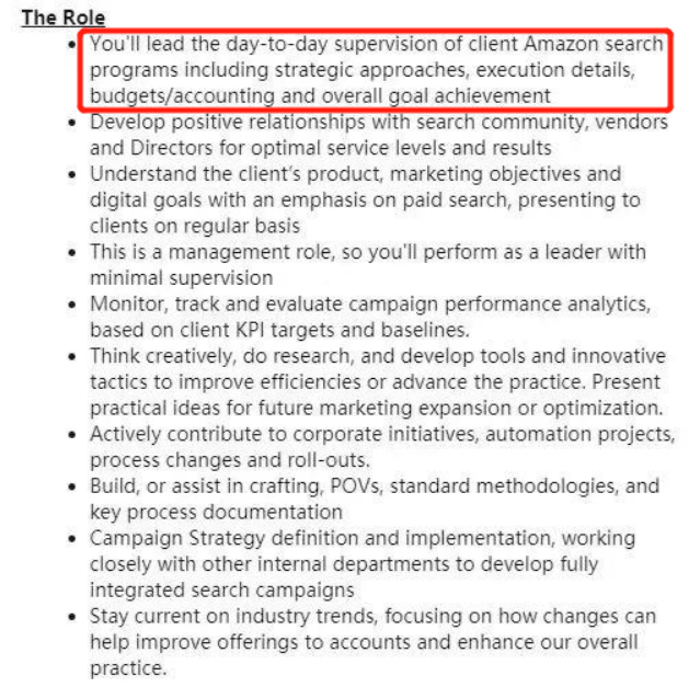 除了Amazon自身的岗位之外,GroupM的Manager, Amazon Search和Nestlé Waters的Marketing Manager, eCommerce岗位也都要求求职者具备Amazon搜索广告方面的经验: