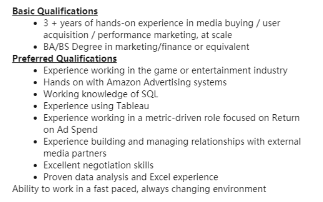 可以看到,要求求职者要有1-3年,甚至3年以上的相关工作经验,同时要熟练掌握Amazon Advertising、Google Ads、Google Analytics等岗位必备技能。甚至求职者掌握SQL等数据分析工具或拥有数据分析技能也是一大加分项。