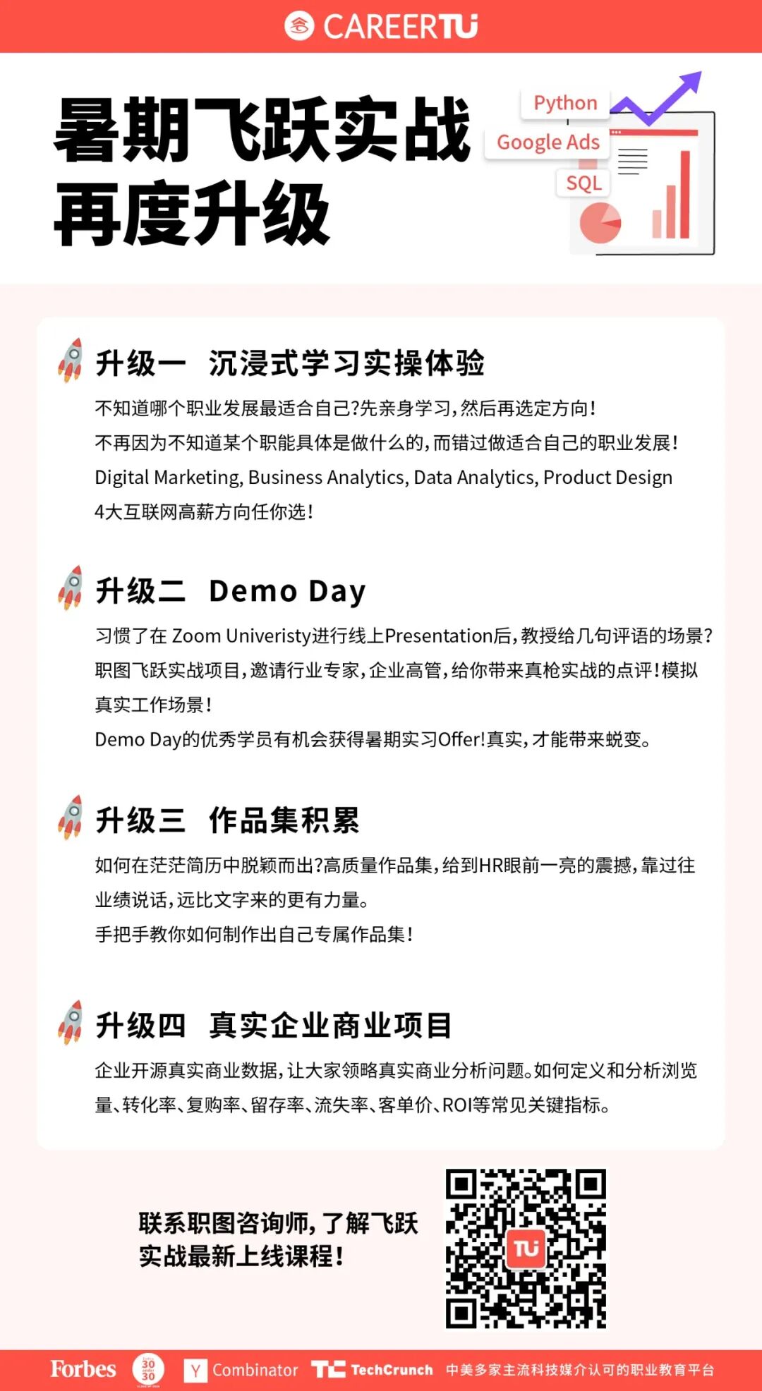 职图飞跃实战项目,邀请行业专家,企业高管,给你带来真枪实战的点评!模拟真实工作场景!Demo Day的优秀学员有机会获得暑期实习Offer!