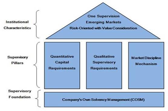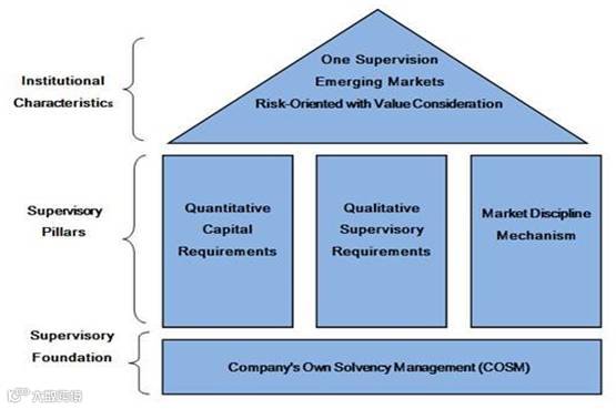 By appropriating the most useful features of existing global regimes, C-ROSS has formulated a risk-based supervision regime that is on par with global standards, yet remains tailored to the specifics of the Chinese insurance market. In common with Solvency II in the EU, three key pillars underpin these rules, which can be summarized as: 1) Quantitative - laying down how much capital the insurers must hold; 2) Qualitative - internal governance and formal supervision; and 3) Disclosure requirements - so that the market may more accurately assess and price insurers, and supervise unregulated risks[2] . The structure is as follows: