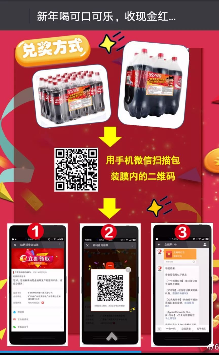 可口可乐在产品上放置“唯一可识别二维码”,消费者可领取红包奖励和查询产品真伪信息,新年期间,可口可乐还启用“智能营销系统”,打造“新年喝可口可乐 收现金红包”营销活动,终端消费者扫码领取现金红包。