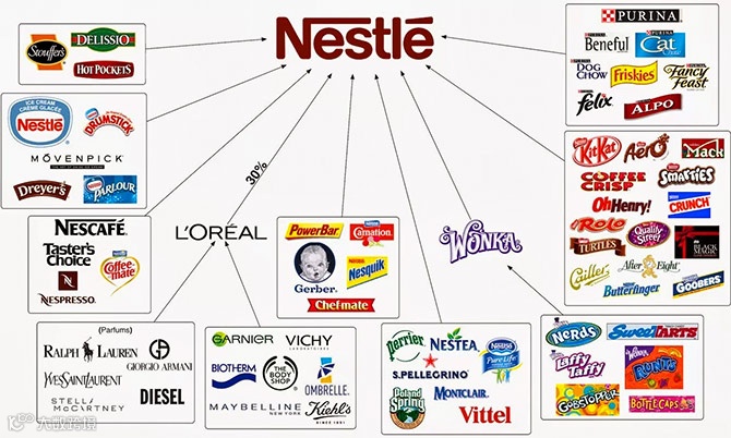 更有意思的是,你会发现欧莱雅集团背后竟然是雀巢,要知道欧莱雅旗下丰富的品牌线,以及和LVMH、宝洁、联合利华的故事,都可以单拎出来写一篇了。这是因为1974年,因为欧莱雅集团害怕被收归国有,所以选择用一半股份置换雀巢3%的股份,自此,雀巢成为欧莱雅的最大股东。