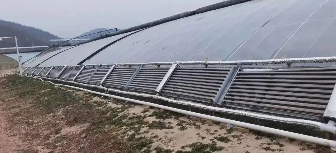 由西北农林科技大学设计,利用温室保温被空间,通过室外真空管太阳能集热器进行热量收集,将投射到保温被上的太阳辐射加以高效利用,并将收集的热量存储到温室相变储热器中,吸收一天的太阳辐射可在连续阴天中持续释放多天热量,直接用于夜间温室内植株根系的加温。