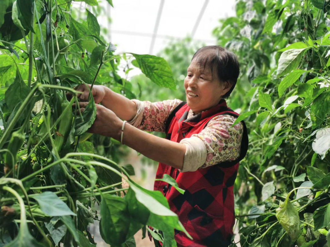 Δ田西村村民郭乖红在田家寨健康农业产业园采摘成熟的辣椒