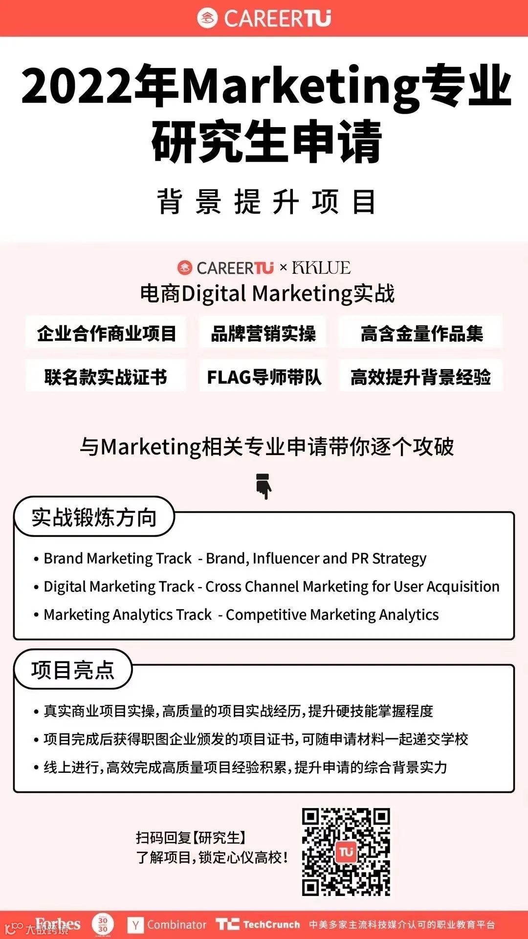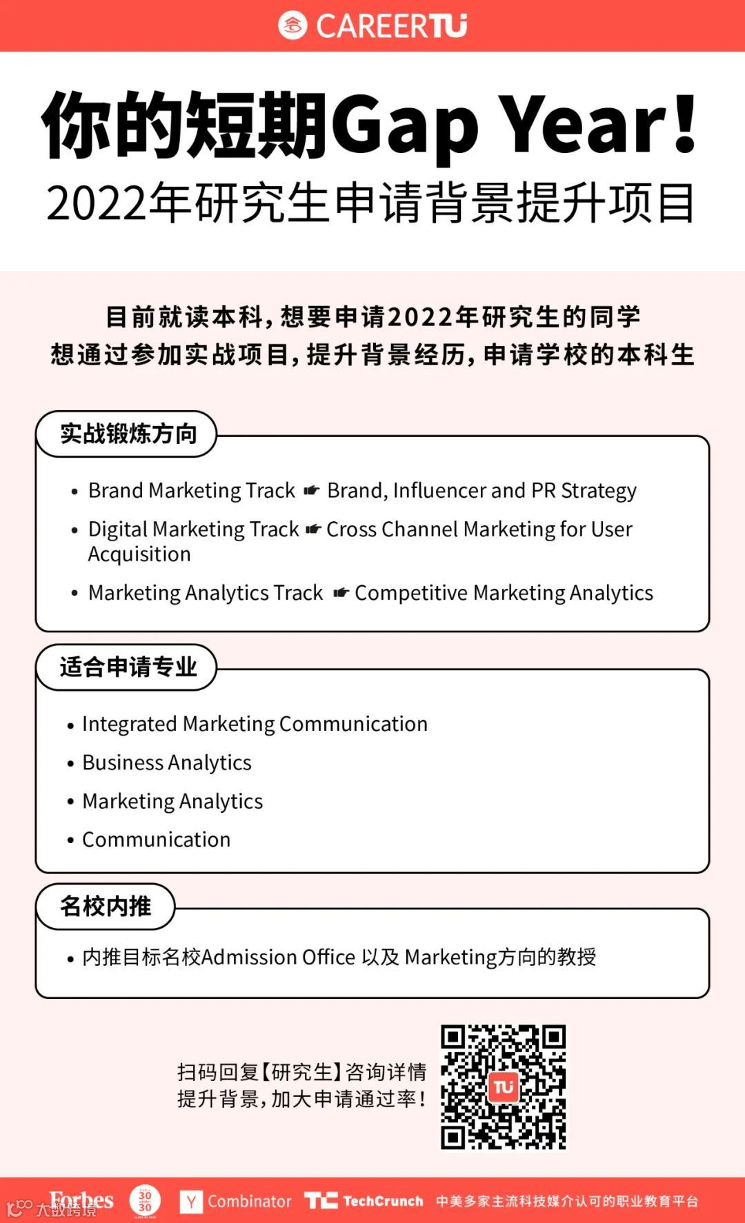 想要成功斩获时尚美妆、电商行业Offer,重中之重是要有相关的、高含金量的项目经历、实习经历,在真实商业场景中去实操,掌握岗位必备技能。而职图飞跃实战项目可以帮助积累一段高含金量的实操经验。同时针对想要提升自己背景经历的同学,我们也推出了2022年研究生申请背景提升项目。