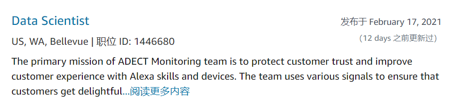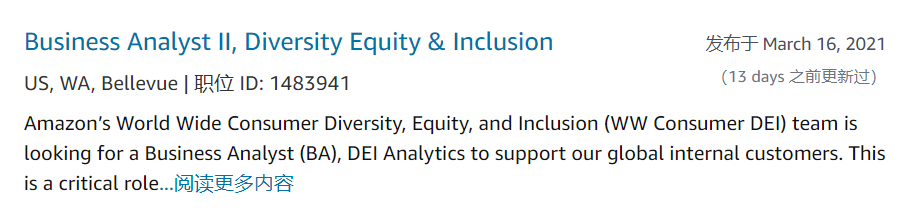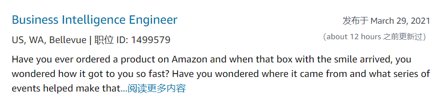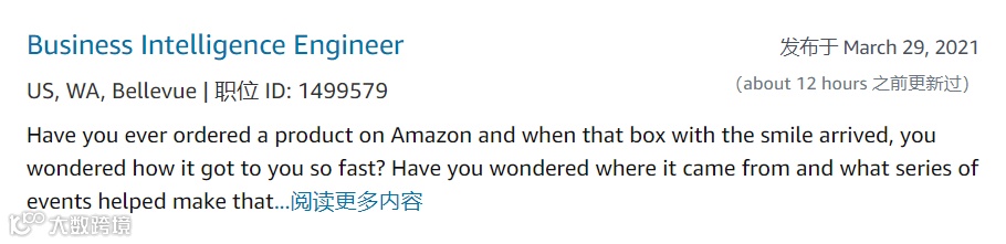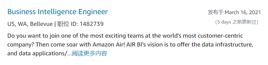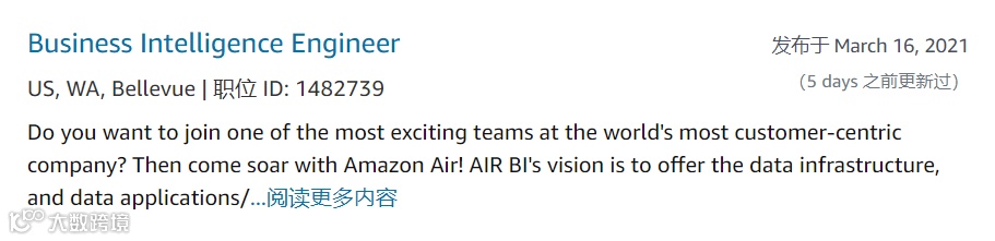 目前在Amazon官网可以看到在Bellevue已经有大量数据岗位在进行招聘,其中包含许多Amazon热招的Business Intelligence Engineer岗位,足以看出Amazon对于数据人才的需求:
