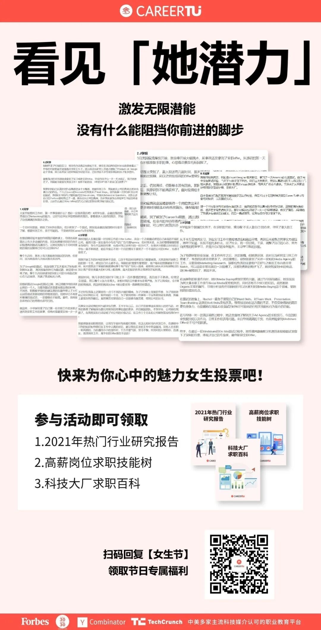在女生节到来之际,CareerTu带你一起来看见女性力量,看学姐们如何激发潜能,迭代自我!